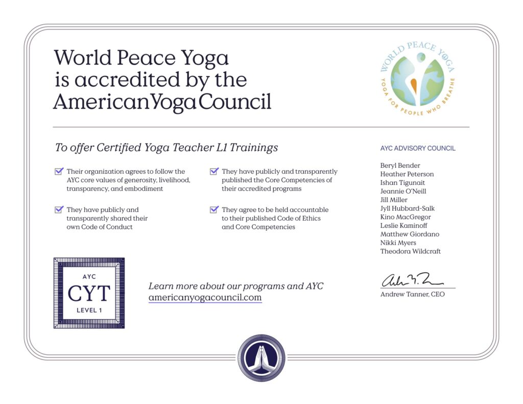 Upon completing the Compassion for All Yoga Teacher Training, you will receive a 200-hour CYT certification, recognized and accredited by the American Yoga Council (AYC). This credential allows you to teach in studios, online platforms, or even start your own yoga workshops. You may also take this course for personal growth to receive a certificate marking a significant milestone in your spiritual journey.